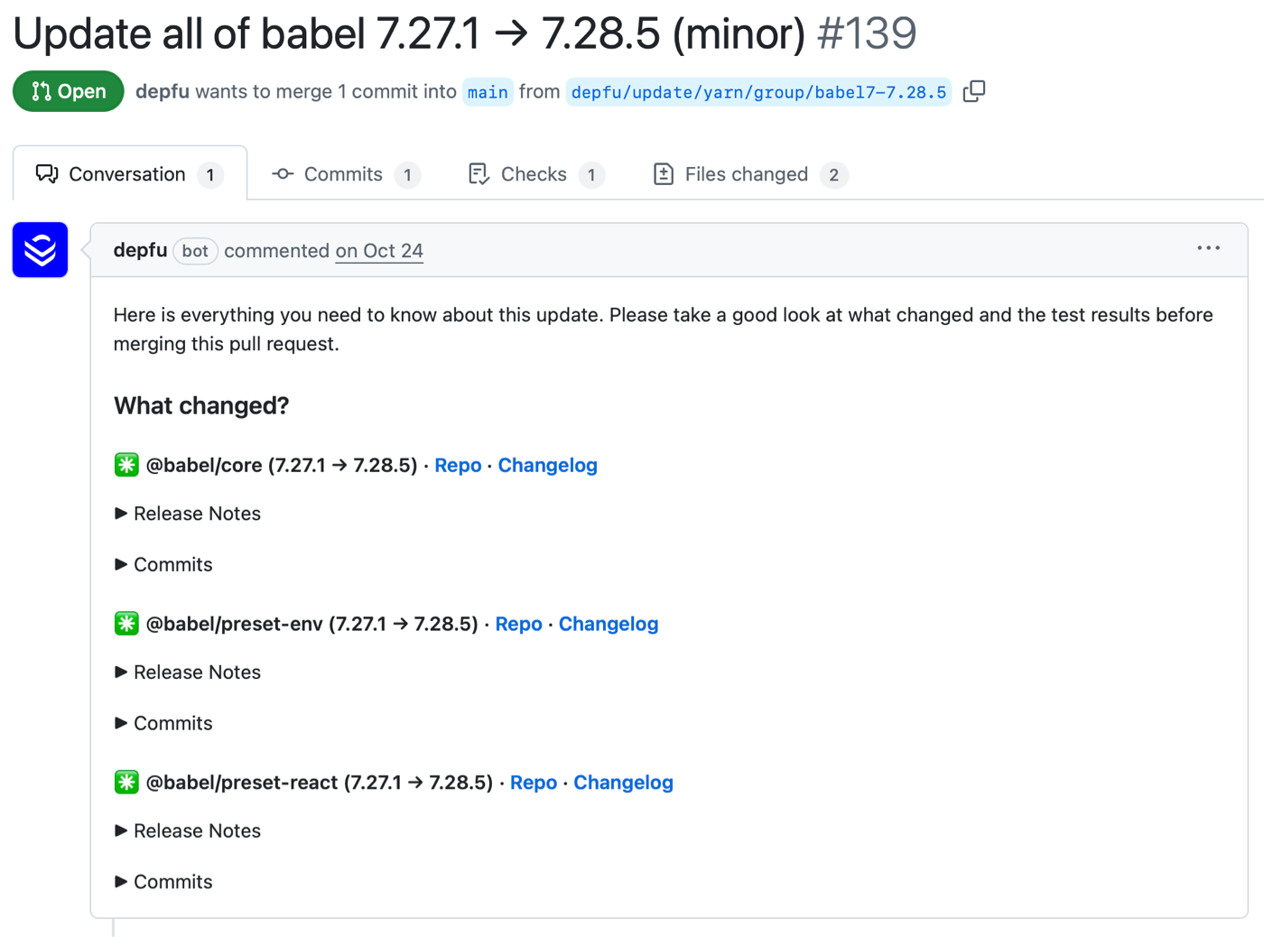 Please note that for freshly added repos (freshly added to Depfu, that is), the first grouped updates for private groups may take a little longer to appear. Mainly because we’ll need to ask you for credentials to the package registry and only after that we can figure out if updates are available.
